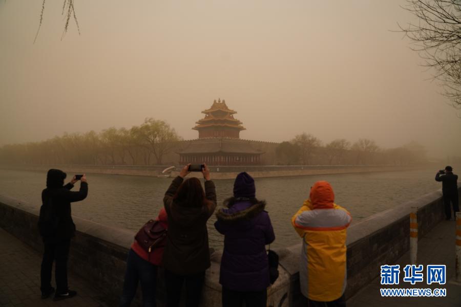 3月15日,人们在拍摄故宫角楼。当日,北京市遭遇沙尘天气。